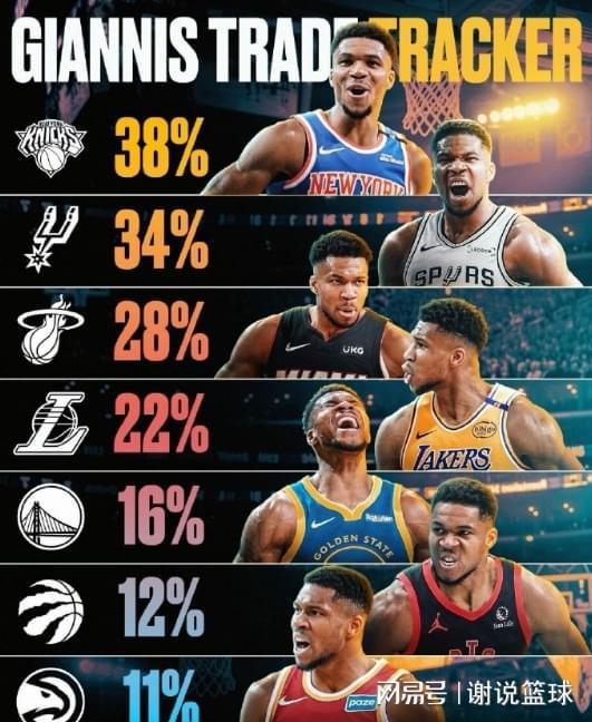 那么字母哥真改换门庭,他的潜在下家赔率,目前也已经出炉了。尼克斯高居榜首,湖人和勇士都进入前五,马刺可能是头号搅局者,他们仅次于尼克斯,以34%的概率成为字母哥第二可能去处。