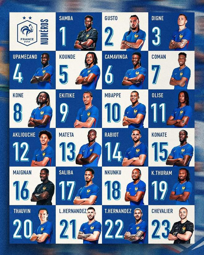 前锋:12-阿克利乌什(摩纳哥)、7-金斯利-科曼(利雅得胜利)、9-埃基蒂克(利物浦)、13-马特塔(水晶宫)、10-姆巴佩(皇家马德里)、18-恩昆库(米兰)、20-托万(朗斯)