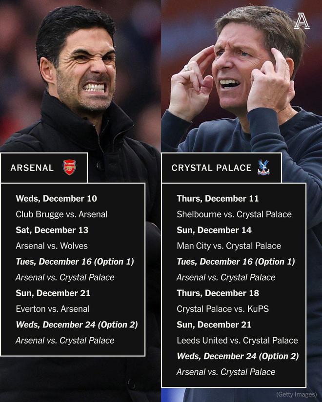 看来比赛日期要么是12月16日(这意味着水晶宫将在8天内踢4场比赛),要么是平安夜,英超联赛尚未确认节礼日及之后英国的转播安排,这可能会让情况更加复杂。