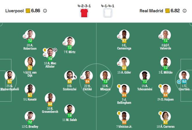 利物浦首发:25-马马尔达什维利(6.7分)、12-布拉德利(7.2分)、5-科纳特(6.7分)、4-范戴克(6.7分)、26-罗伯逊(7.2分)、38-赫拉芬贝赫(6.8分)、8-索博斯洛伊(6.9分)、10-麦卡利斯特(7.6分)、7-维尔茨(7.2分)、11-萨拉赫(7.8分)、22-埃基蒂克(6.4分)