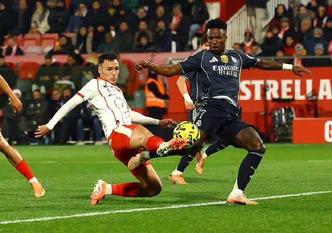 比赛开始后皇马没有意外占据进攻主导权,只是银河战舰上半场10次射门,只有1次命中门框范围内;第9分钟,姆巴佩禁区内过人摆脱回敲,居莱尔弧顶处不停球劲射稍稍高出;第12分钟,赫罗纳后场失误,姆巴佩小角度射门打高;第23分钟,维尼修斯肋部强突禁区左脚低射,皮球还是偏离了球门。